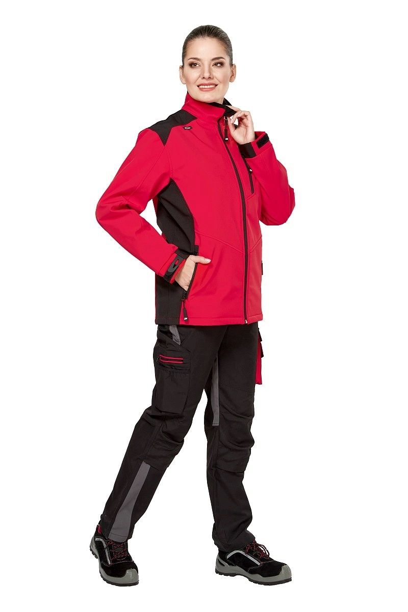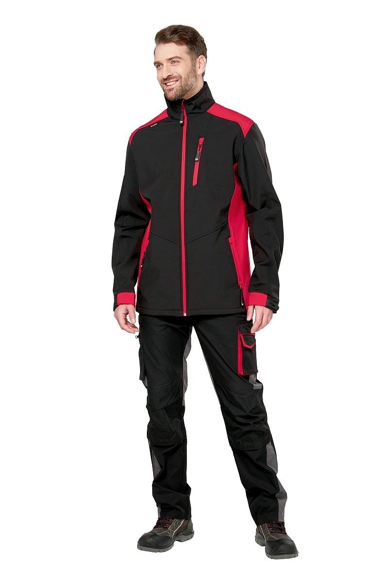 Куртка демисезонная универсальная унисекс из прочного синтетического материала Софтшелл черного цвета в сочетании с деталями красного цвета, для защиты от общих производственных загрязнений, механических воздействих (истирания), для защиты от ветра и влаги.