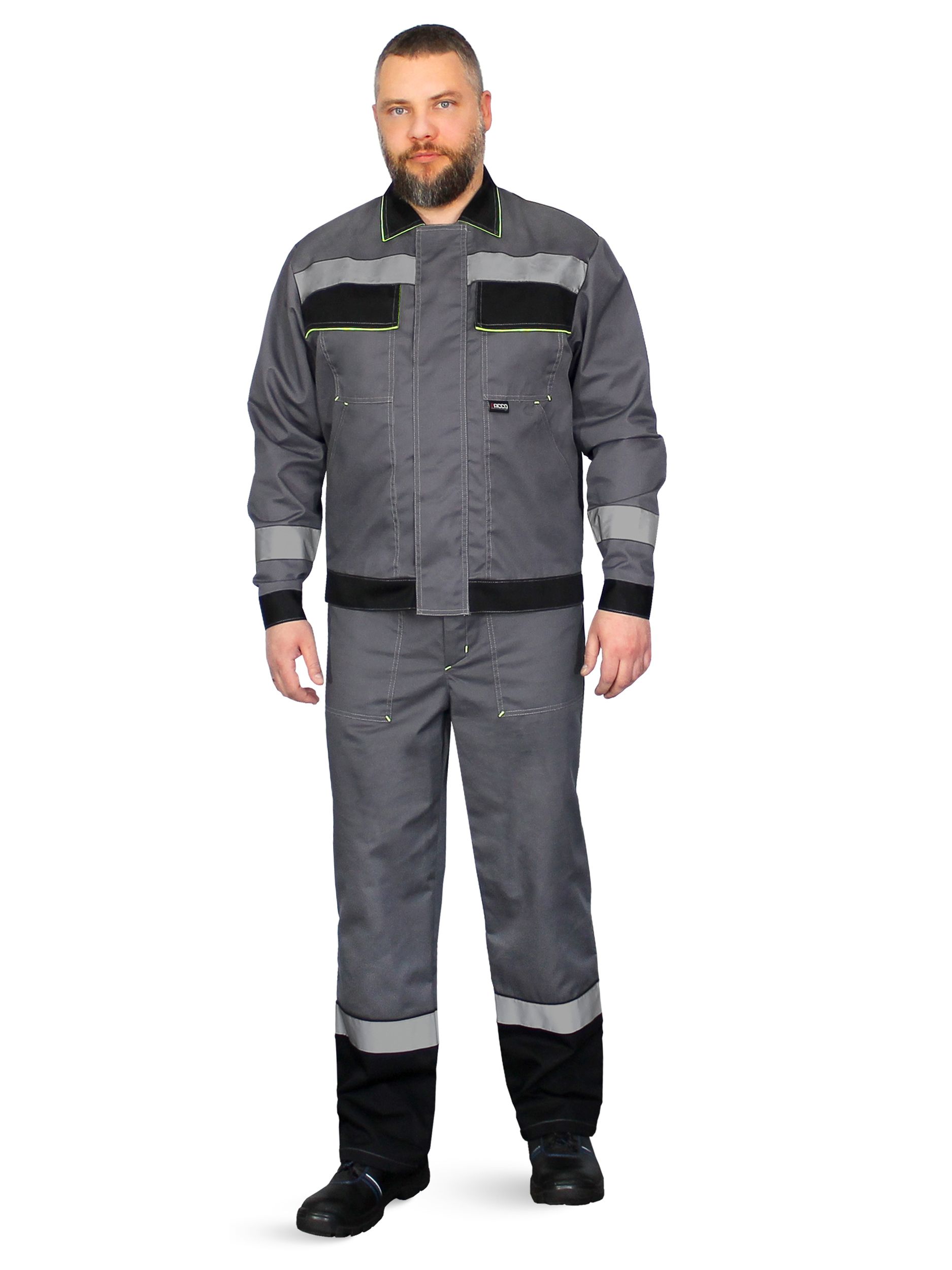 ККуртка на притачном поясе с центральной бортовой застёжкой на тесьму-молнию с ветрозащитным клапаном, отложным воротником. На куртке имеются два нагрудных накладных кармана с клапанами и два нижних накладных кармана с наклонным входом. Световозвращающая полоса по низу кокеток полочек, на спине, вкруговую по нижней части рукава и по нижней части полукомбинезона, шириной 50 мм. Полукомбинезон с притачным нагрудником с поясом, высокой спинкой, бретелями с эластичной тесьмой, пристегивающимися на застежку-трезубец, боковой застежкой, центральной застежкой-гульфик. Нагрудник полукомбинезона с накладным карманом с клапаном на липучке.
