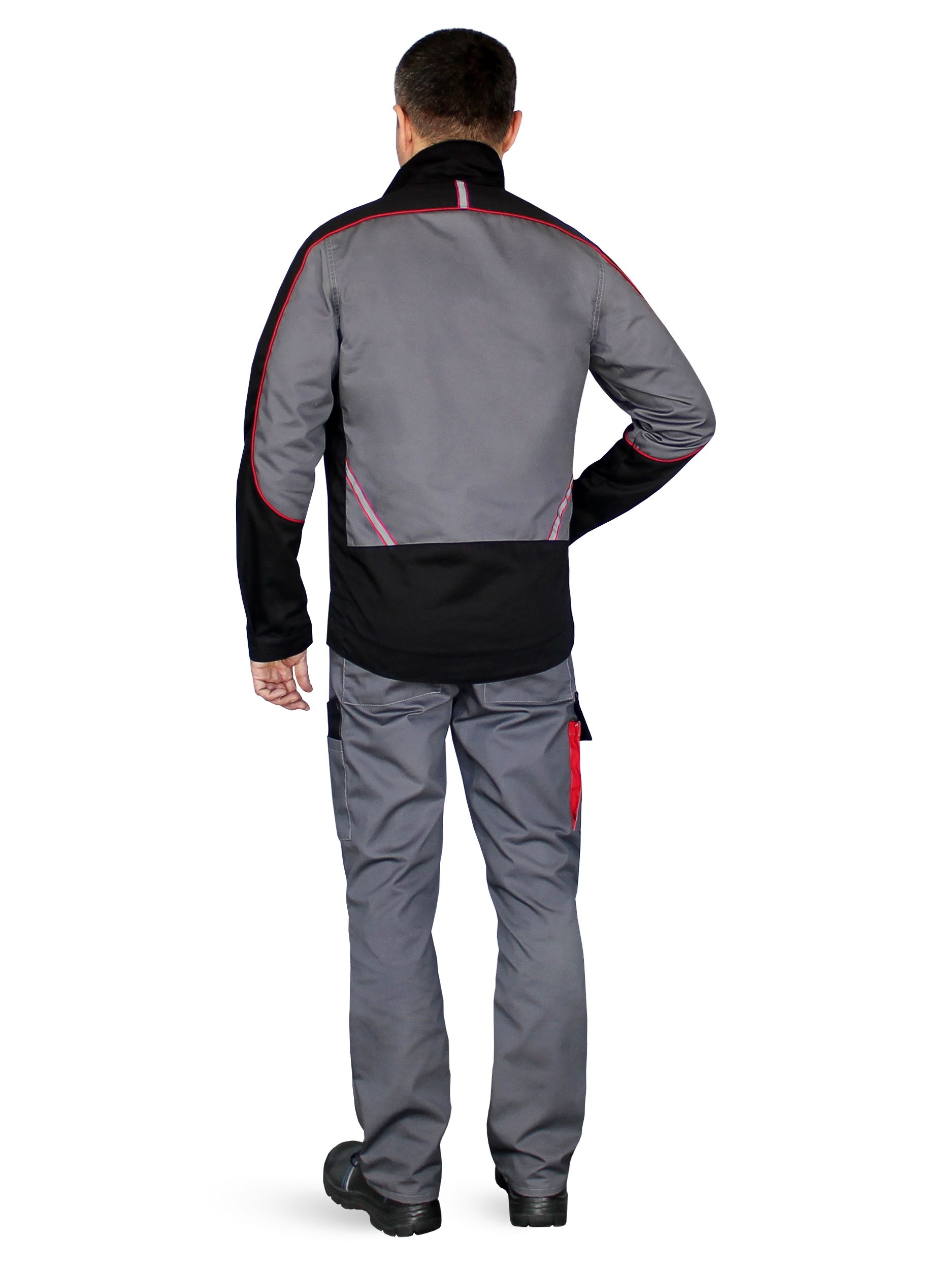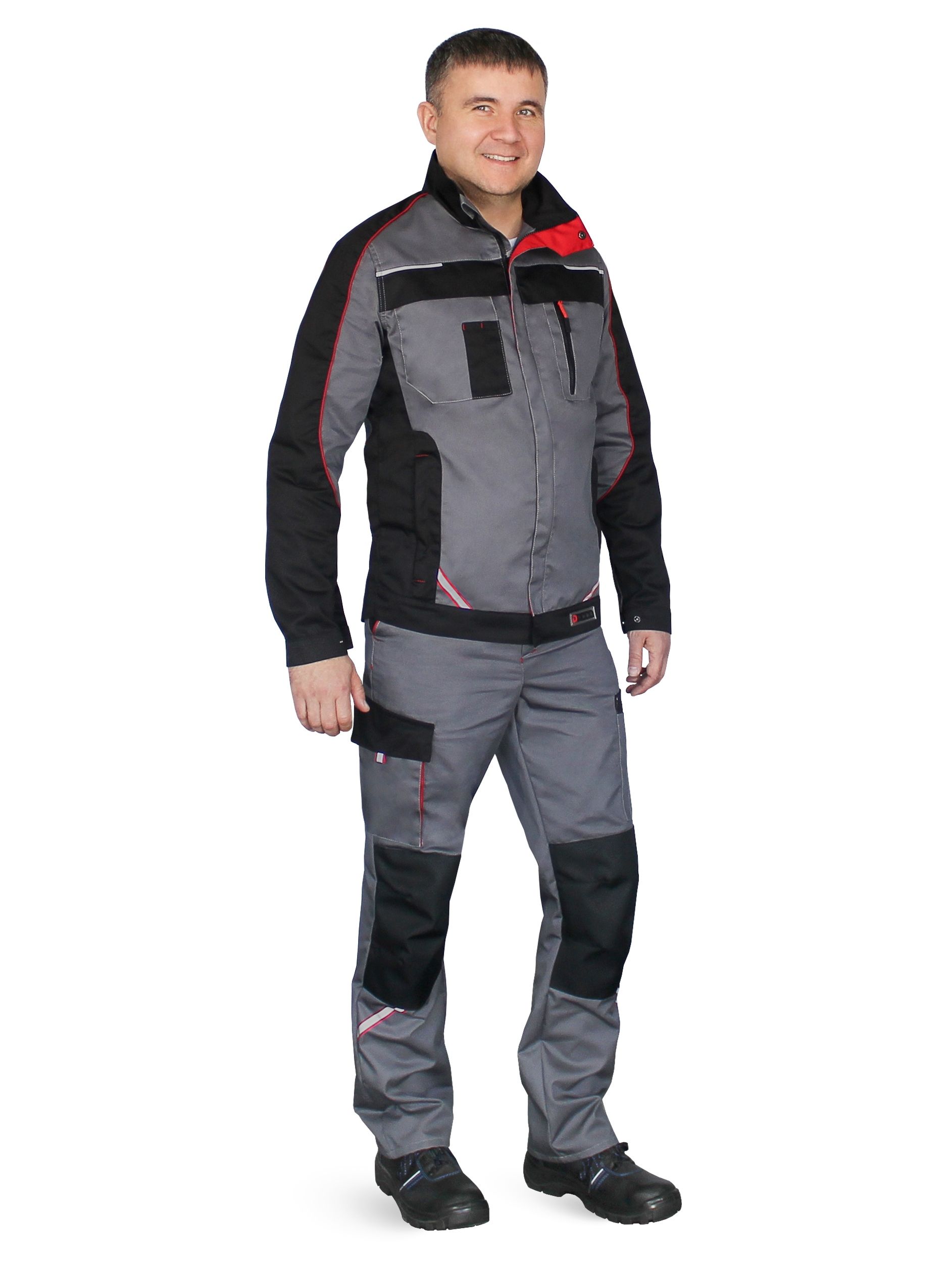 Куртка прямого силуэта с воротником-стойкой, с центральной застёжкой на молнию и ветрозащитный клапан застёгивающийся на две потайные кнопки. Два нагрудных и два боковых кармана. Верхний левый карман накладной с дополнительным накладным отделом для карандаша. Верхний правый карман накладной с застёжкой - “молнией”. Нижние боковые карманы вертикальные с застёжкой на молнию. Брюки с центральной застежкой на молнию с резинкой по боковым сторонам пояса. Пояс со шлевками. Функциональные карманы по бокам. Усилительные объемные наколенники из ткани ТАСЛАН предохраняют от протирания.