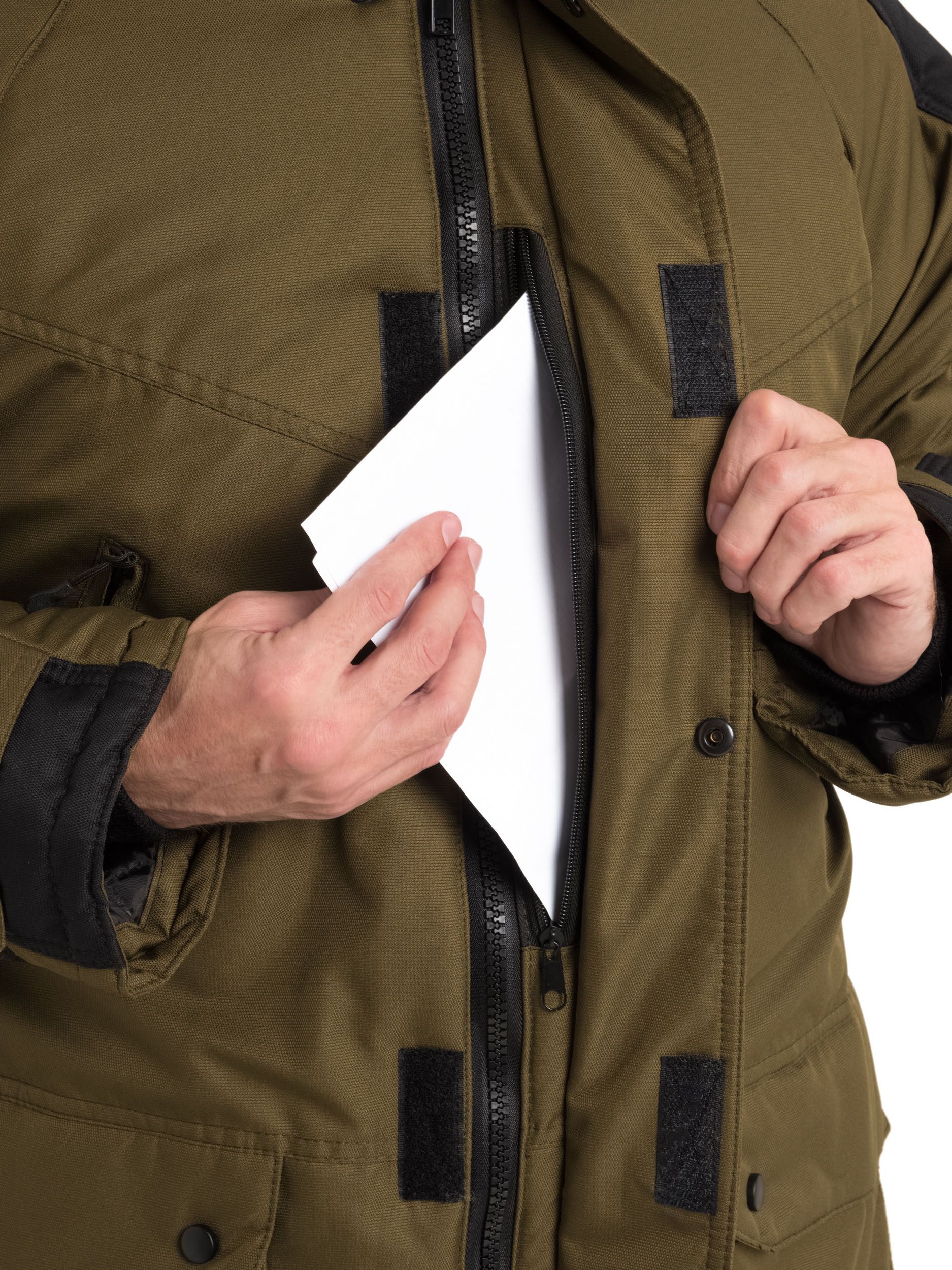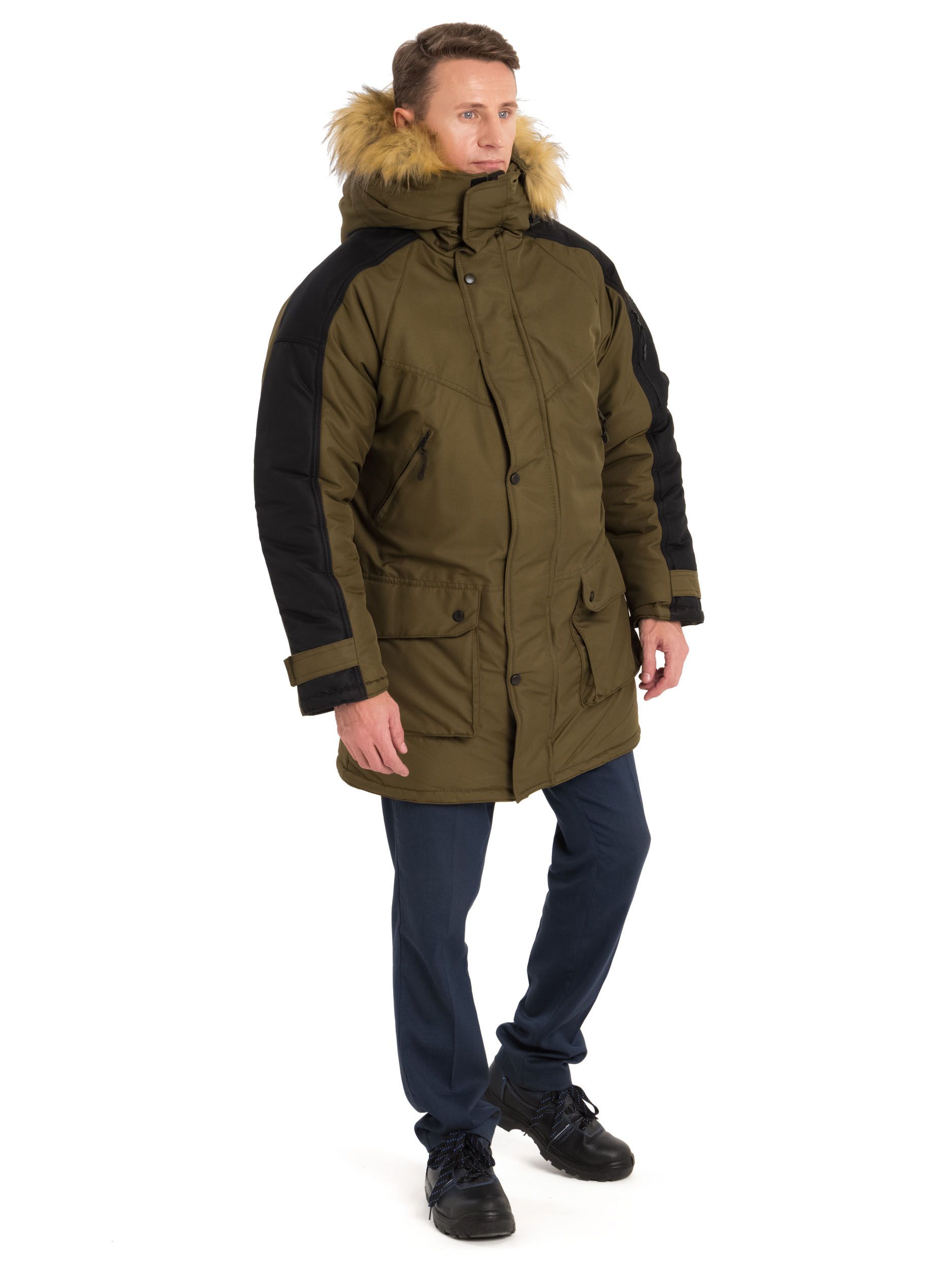 Застежка на двухзамковую молнию и ветрозащитныи? клапан. Капюшон со съемнои? опушкои? из искусственного меха (енот) стягивается шнуром. Рукава с полушерстяными напульсниками, регулируются по ширине патои?. Накладнои? карман на левом рукаве, внутренние карманы, под ветрозащитным клапаном – потаи?нои? карман с молниеи? (для планшета и документов формата А4). Внутренняя ветрозащитная юбка.