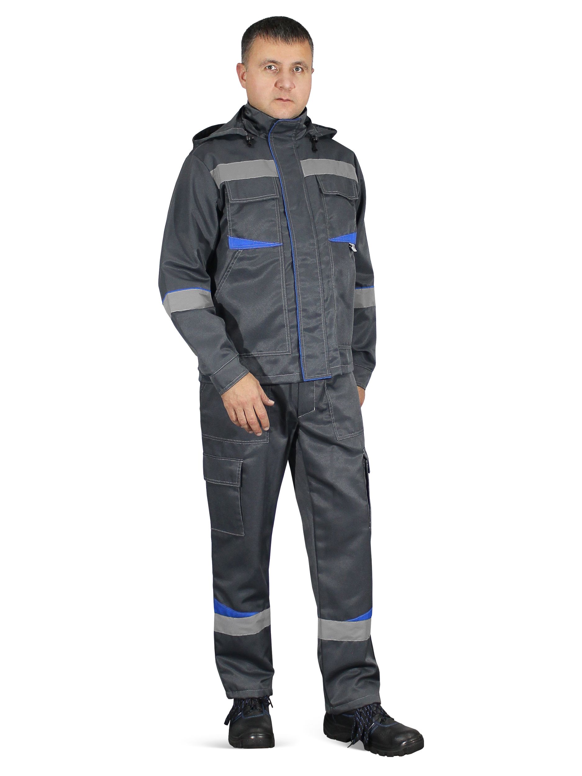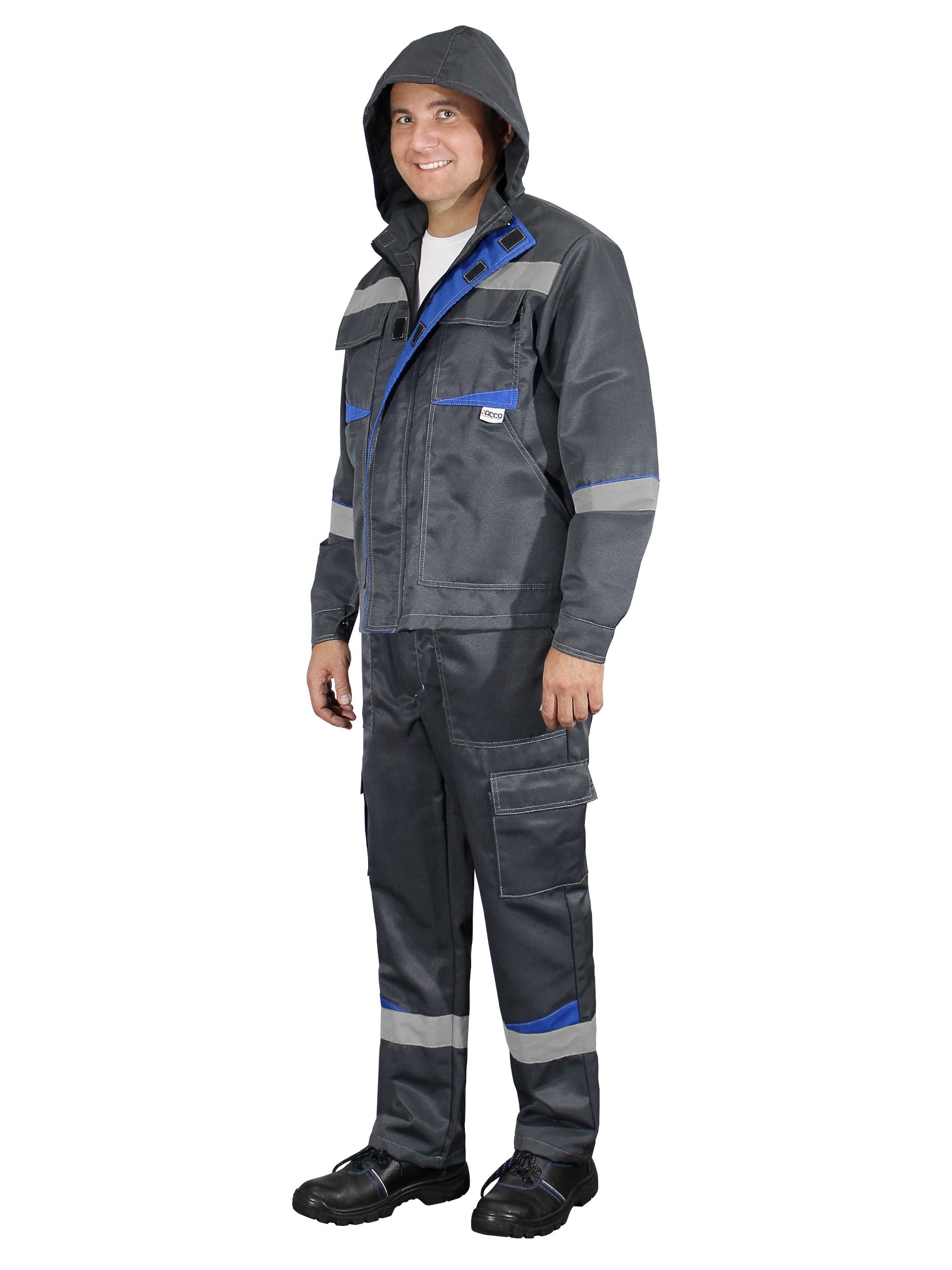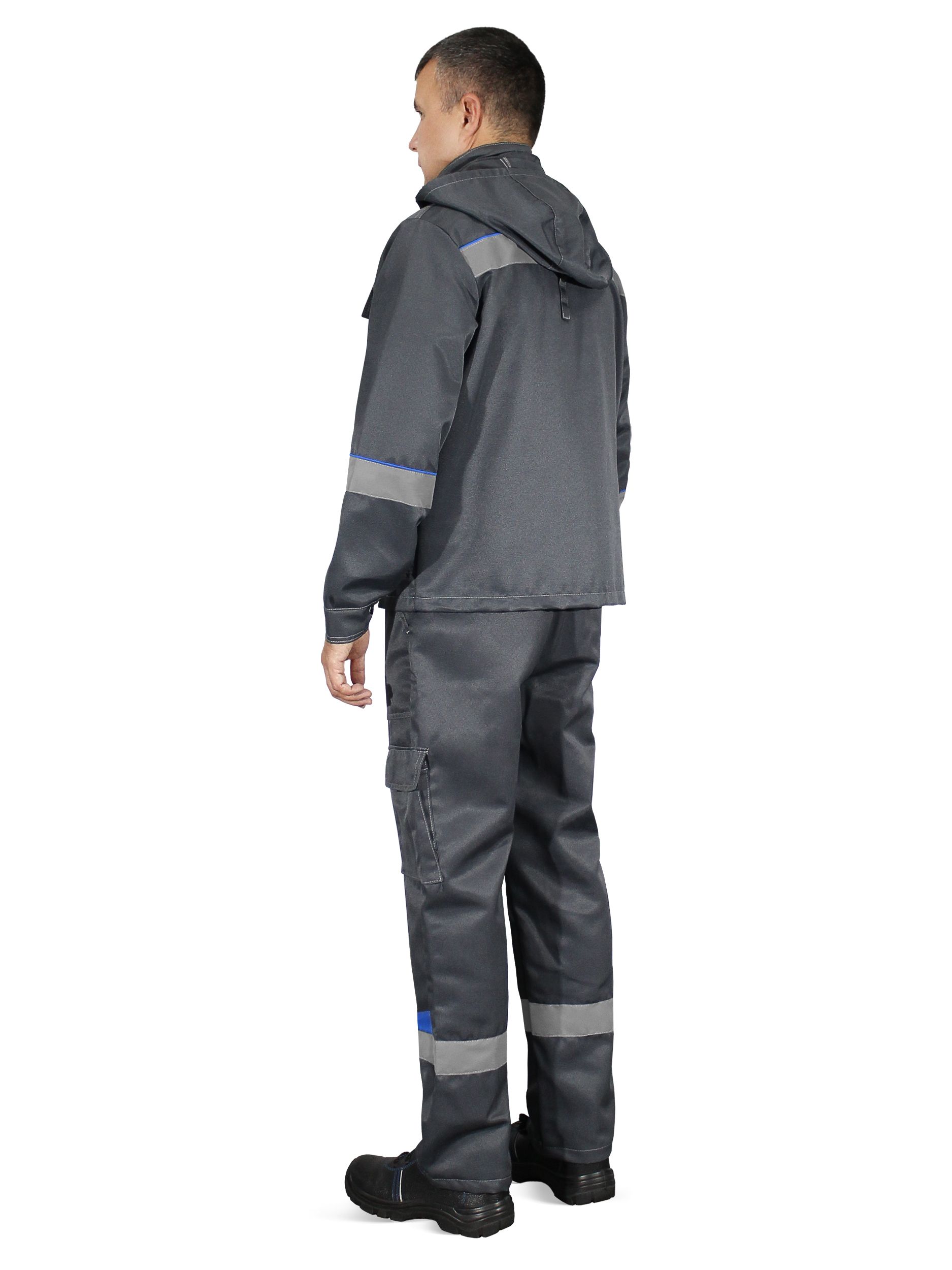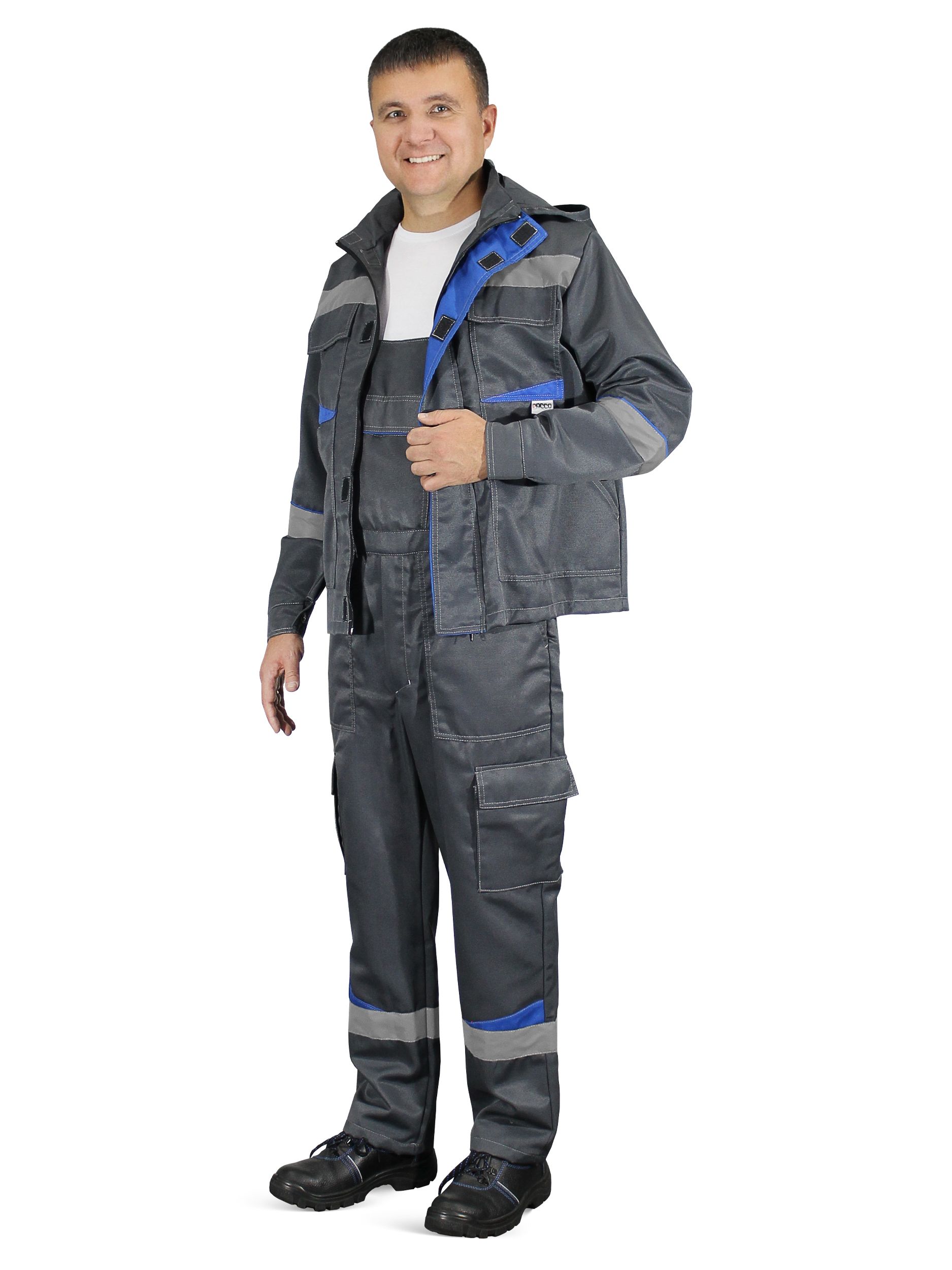 Куртка прямого силуэта с воротником-стойкой и капюшоном; центральной супатной застежкой на молнию и контактную ленту. Два нагрудных кармана с клапанами на текстильную застёжку. Нижние карманы с наклонным входом. На кокетках полочки и спинки, а также по низу рукавов расположена световозвращающая лента шириной 50 мм. Съемный капюшон на пуговицах с регулировкой по лицу. На центральной части расположен хлястик, застёгивающийся на два полукольца, регулирующие высоту капюшона. Полукомбинезон с регулируемыми бретелями с застежкой на фастексы. По талии спинки - резинка. Объём полукомбинезона регулируется при помощи пуговиц, расположенных с правой стороны. Имеется один центральный карман с клапаном и боковые карманы с косым входом. По бокам брючин накладные карманы – “полупортфель” с клапаном, застёгивающимся на текстильную застёжку. По низу брючин светоотражающая лента 50 мм.