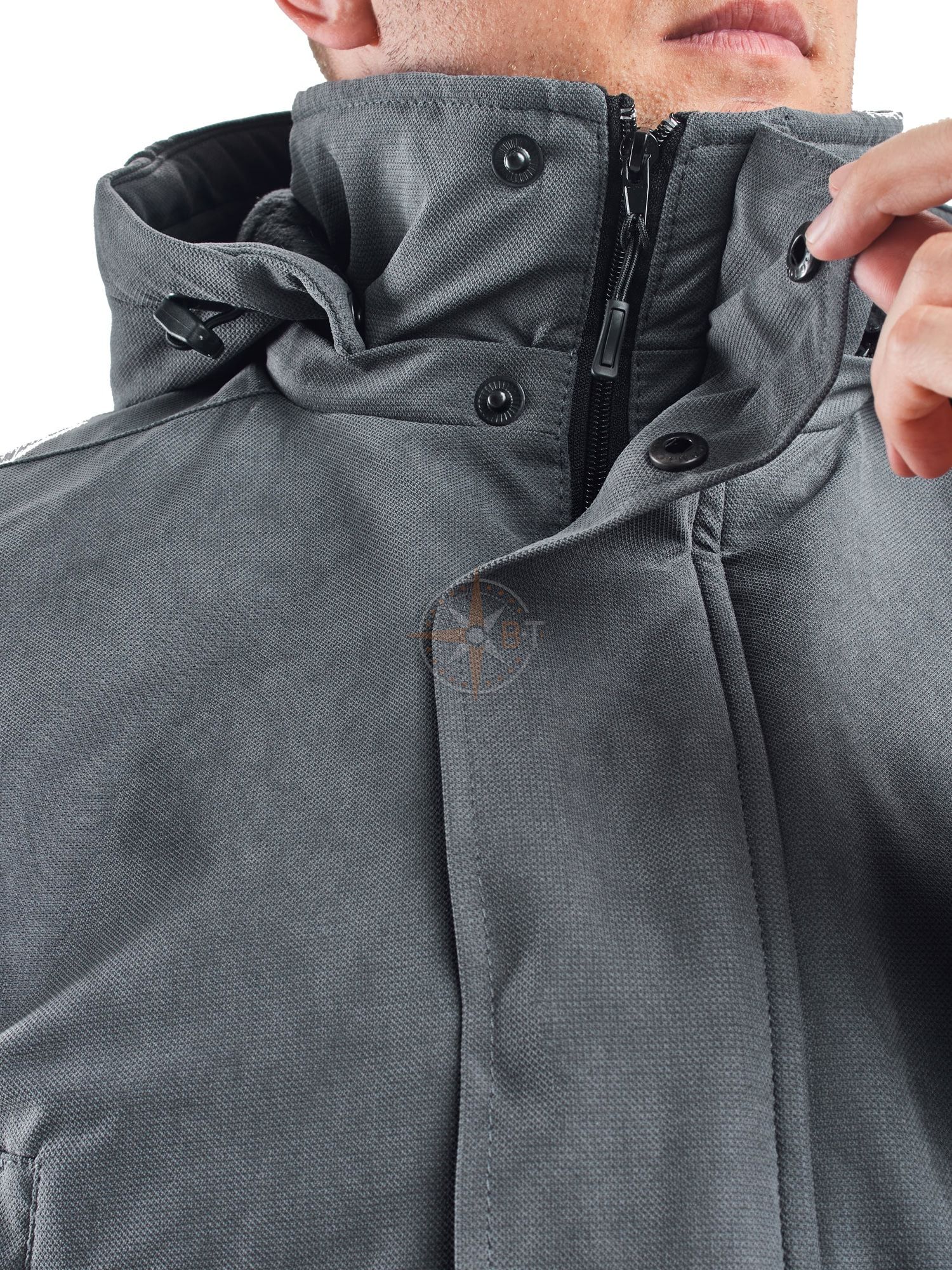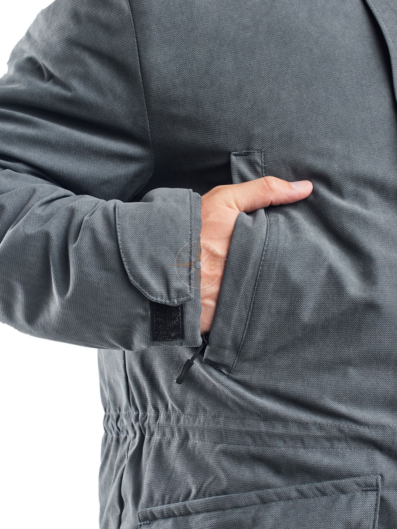 Куртка прямого силуэта с центральной застежкой на молнию, с ветрозащитным клапаном. Спинка цельнокроенная. Полочки с двумя прорезными карманами на молнии двумя накладными объемными карманами с клапанами. Рукава втачные двухшовные. внизу ширина рукава регулируется патой. Воротник-стойка, Куртка с капюшоном, отстегивающимся на молнии. имеется кулиска по линии талии с утягивающим шнуром. Куртка застегивается на кнопки. Подкладка- флис. Рекомендации по уходу: стирать костюм рекомендуется при t до 40С° только в ручном режиме. При чистке больших и тяжелых изделий необходимо предварительно замочить ткань на некоторое время. Стирка производится с применением не агрессивных моющих веществ: мыло, шампуни. Запрещается тереть ткань щетками чтобы не повредить слой пропитки. Выкручивать запрещено, вода должна стечь естественным способом. Сушка – в тени. Гладить с изнаночной стороны запрещено.