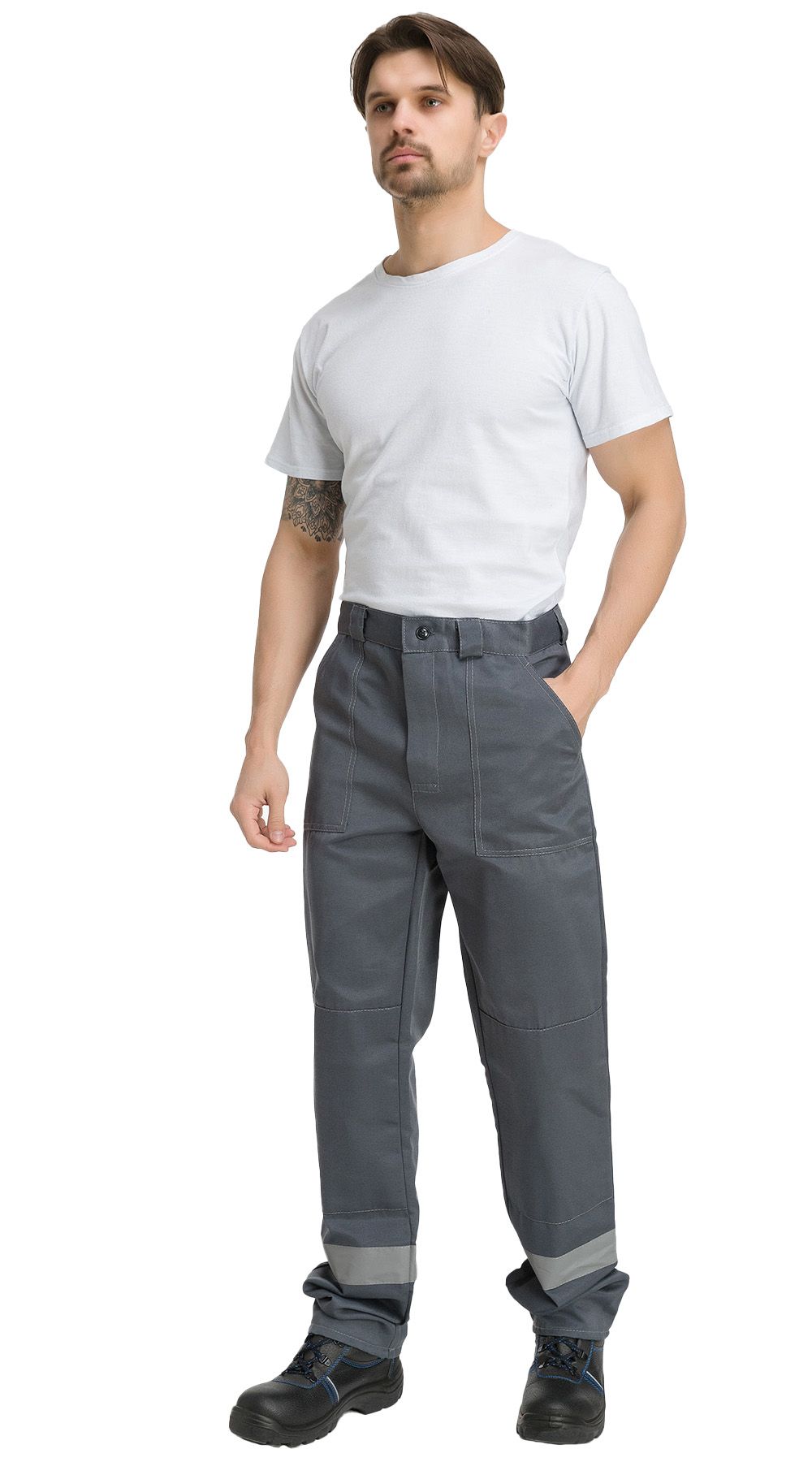 Для повышения безопасности в условиях низкой видимости, на костюме предусмотрены светоотражающие полосы шириной 50 мм, расположенные по линии груди и низу брюк.
