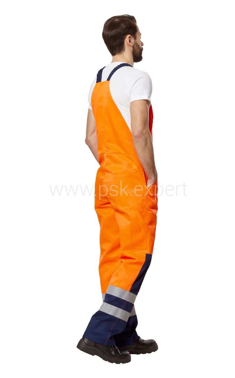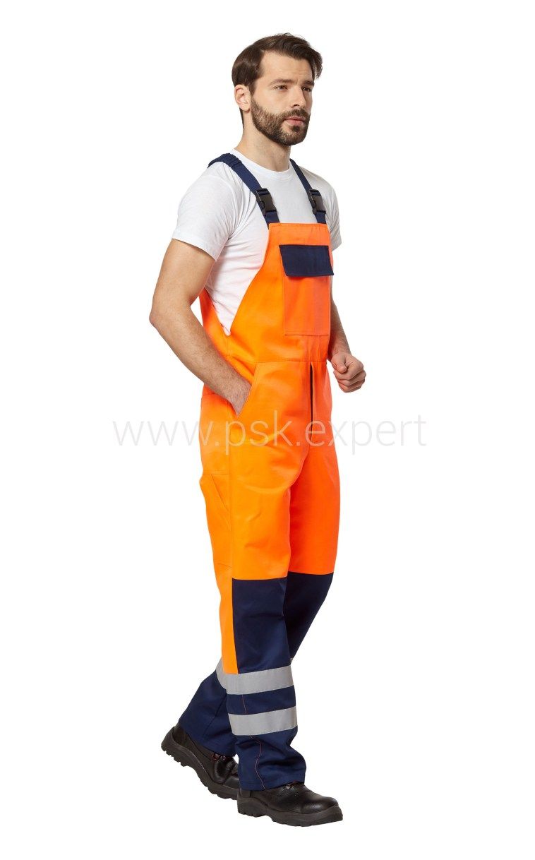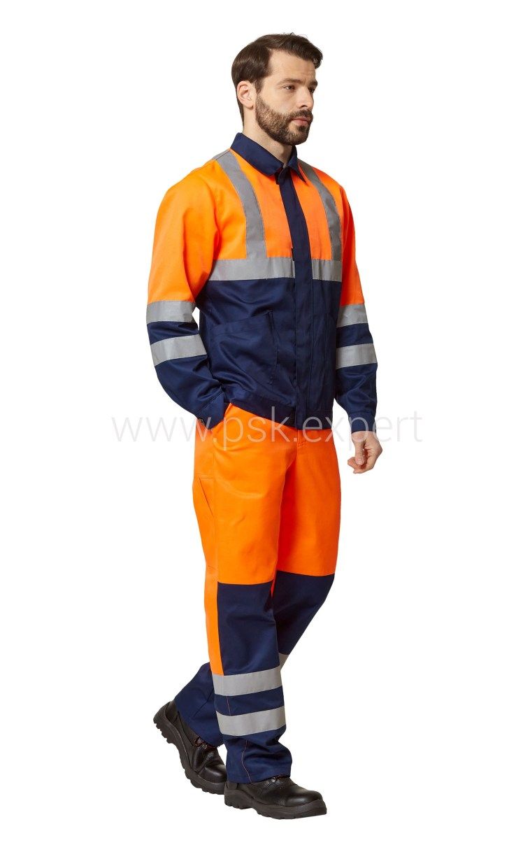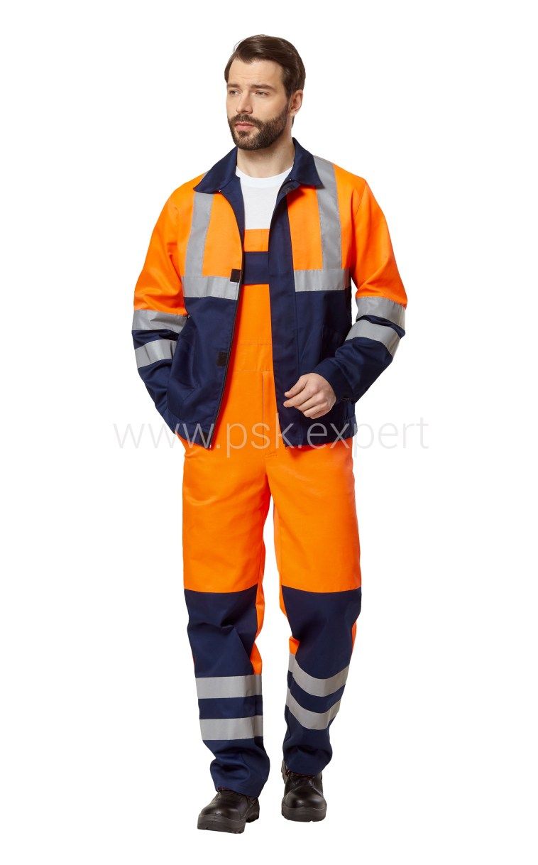 Костюм - куртка и полукомбинезон для защиты от общих производственных загрязнений в различных отраслях промышленности и в качестве сигнальной спецодежды повышенной видимости, для визуального обозначения присутствия носящих ее людей, при дневном освещении и ночью в свете автомобильных фар.