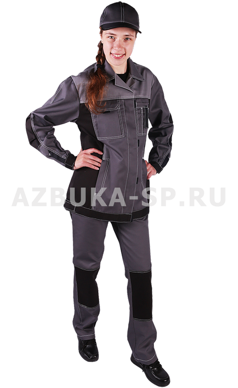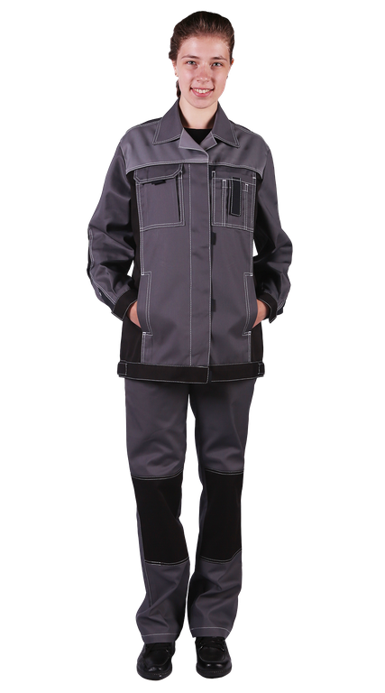 Данное изделие состоит из куртки и полукомбинезона. Куртка укороченная с центральной супатной застежкой на молнию и контактную ленту, с притачным поясом, с втачными рукавами и отложным воротником. Усиления в области локтей и коленей – защищают от ссадин и царапин. Куртка оснащена двумя боковыми внутренними и двумя нагрудными накладными многофункциональными карманами. Вход в боковой карман расположен в шве соединения частей полочки. В местах притачивания контактной ленты (на клапанах карманов и в подборте) паты из контрастной ленты для удобства расстегивания. Спинка с вертикальными складками для свободы движения. В подмышечных впадинах – люверсы для дополнительной вентиляции и комфортной работы. Полукомбинезон на бретелях с эластичной тесьмой, пристегивающийся на высококачественные трехщелевые застежки-фастексы, с притачным поясом, с застежкой-гульфиком на молнию, с застежкой в правом боковом шве на пуговицы. На грудке полукомбинезона расположен широкий карман с тремя отделениями, крайнее правое отделение с клапаном на липучке и с патой из контрастной репсовой ленты для удобства расстегивания. На задних половинках полукомбинезона расположены накладные карманы с петлей и карманом под инструменты. По линии талии сзади на полукомбинезоне расположена эластичная лента, благодаря которой полукомбинезон плотно прилегает к талии. Ширина куртки регулируется на поясе патами. -