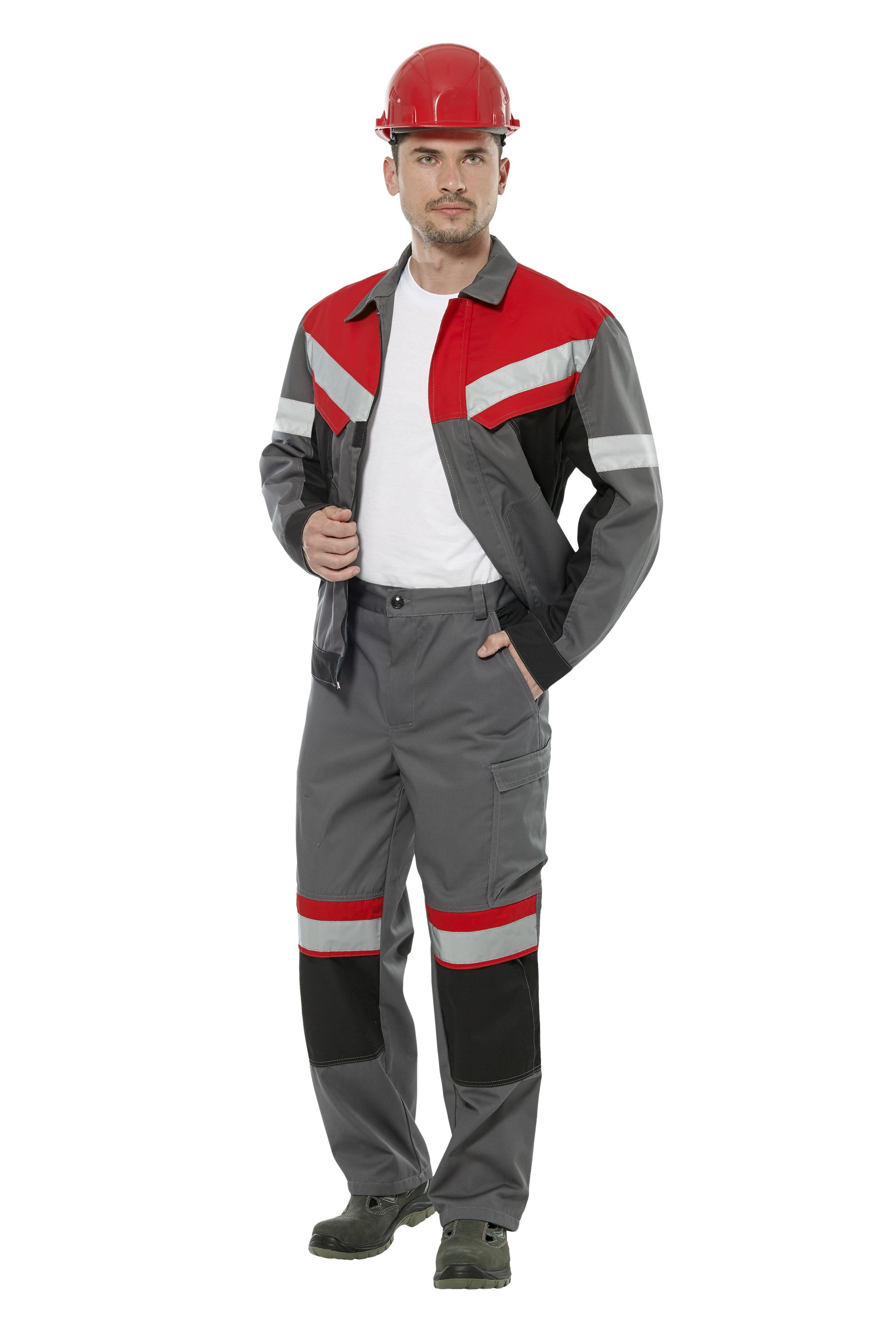 Визуальные элементы защиты: световозвращающая лента шириной 50 мм по швам притачивания кокеток полочек и спинки, средней части рукавов куртки, на клапанах наколенников брюк. -