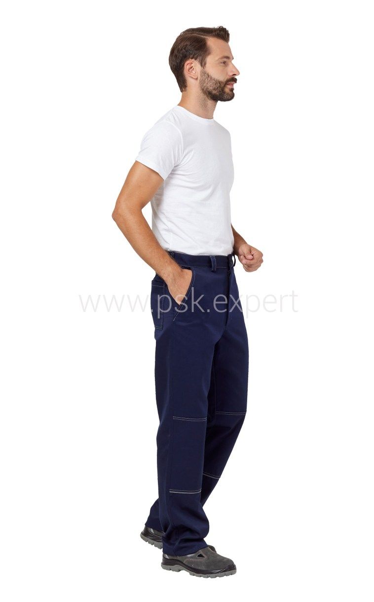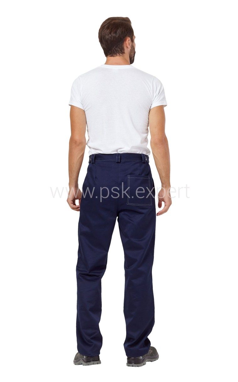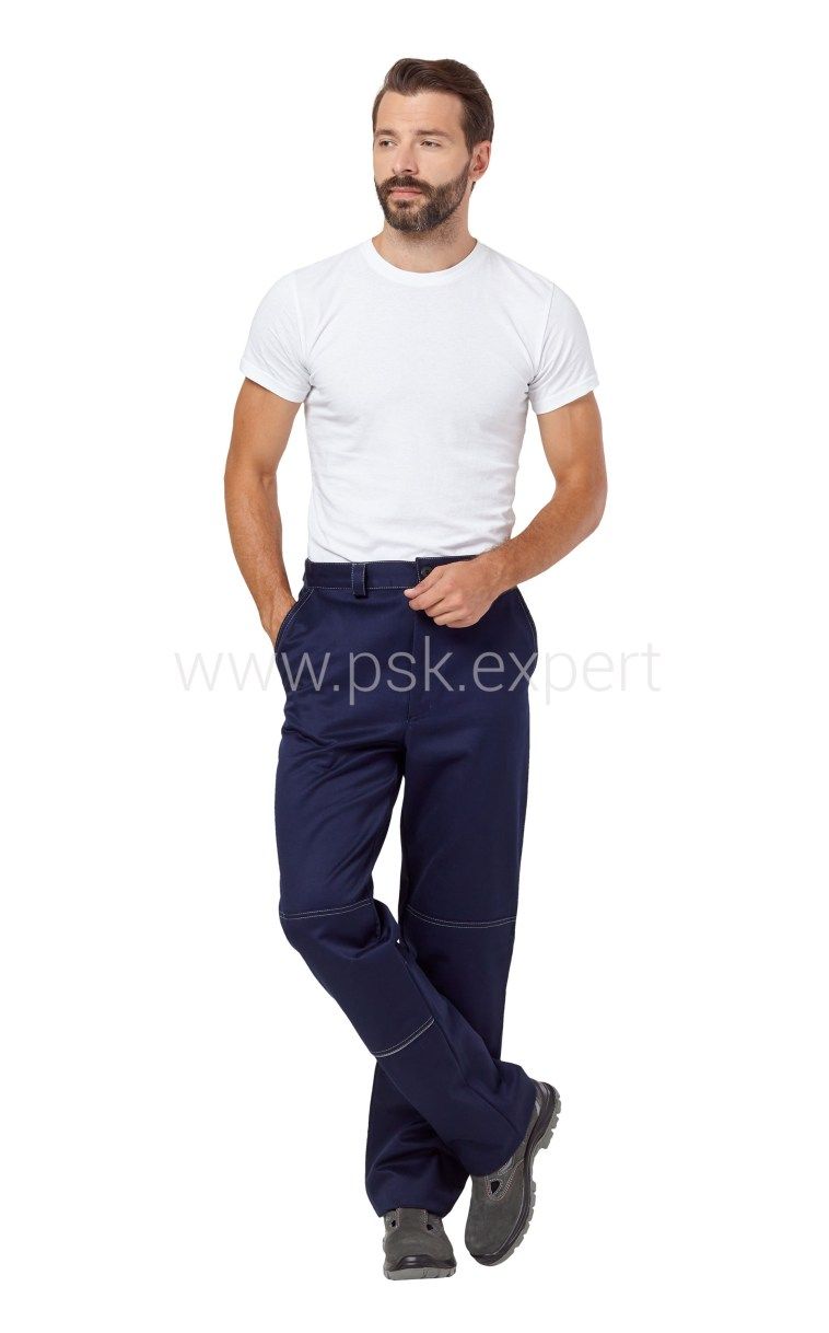 Брюки с притачным поясом со шлевками. Два боковых кармана с отрезным бочком, с усилительными накладками, в нижнюю часть которых втачан СВ кант шириной 3мм. Один задний накладной прямой карман. Застежка-гульфик на молнии.Цвет: Темно-синий,