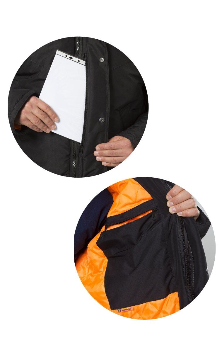 • Карманы: верхние прорезные с листочками на молнии; нижние прорезные с втачными клапанами на контактной ленте и кнопках; в верхней части левого рукава накладной объемный с вертикальной молнией для пропуска; левый прорезной формата А4 на молнии под ветрозащитной планкой; внутренний накладной на молнии
