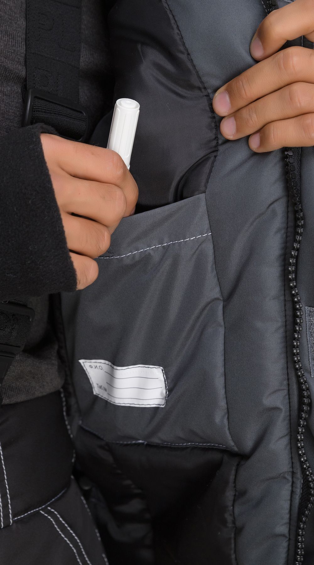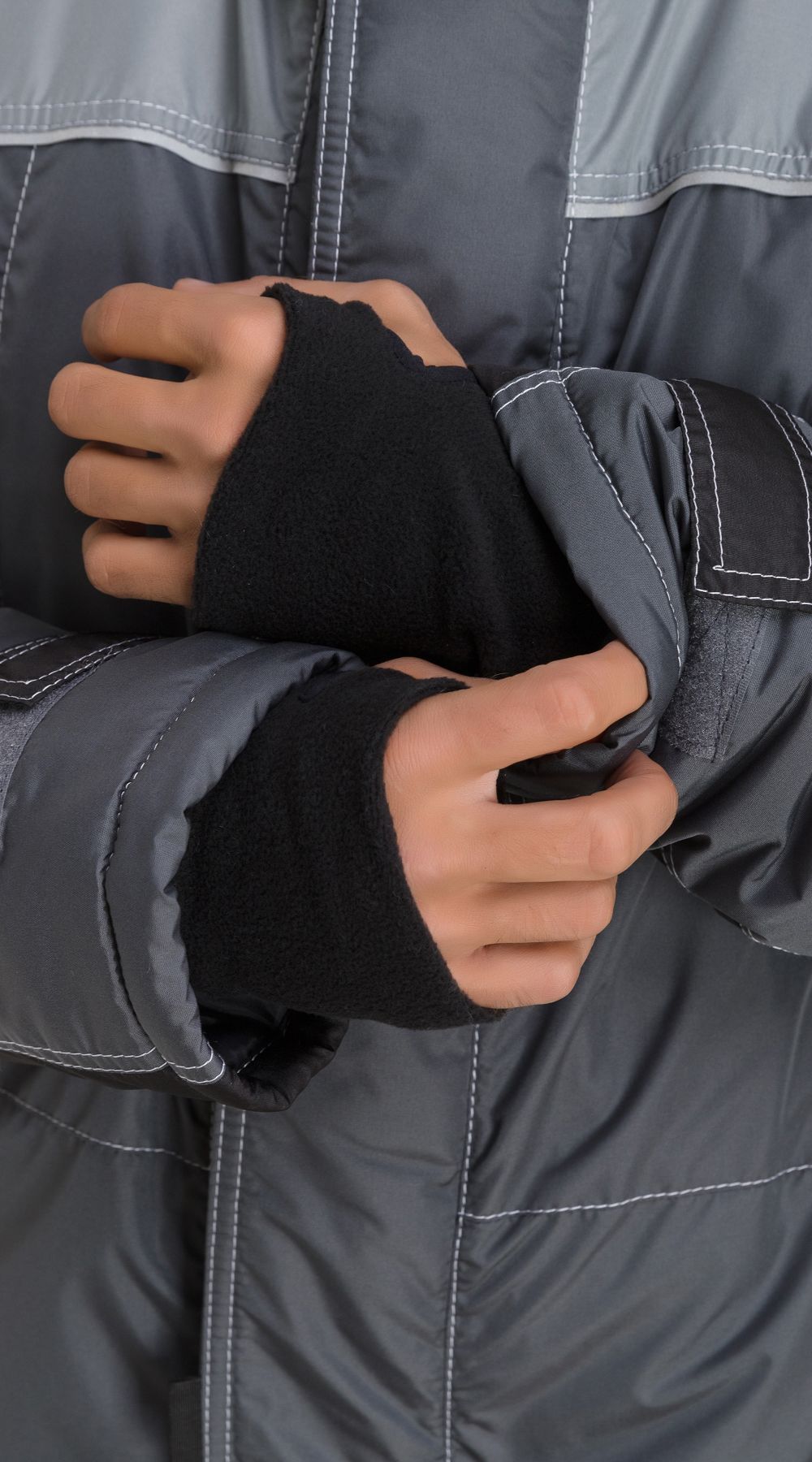 Утеплитель: Синтепон, 150 г/м2 (полочки, спинка 3 слоя, рукав 2 слоя, капюшон и в/з планки 1 слой)
