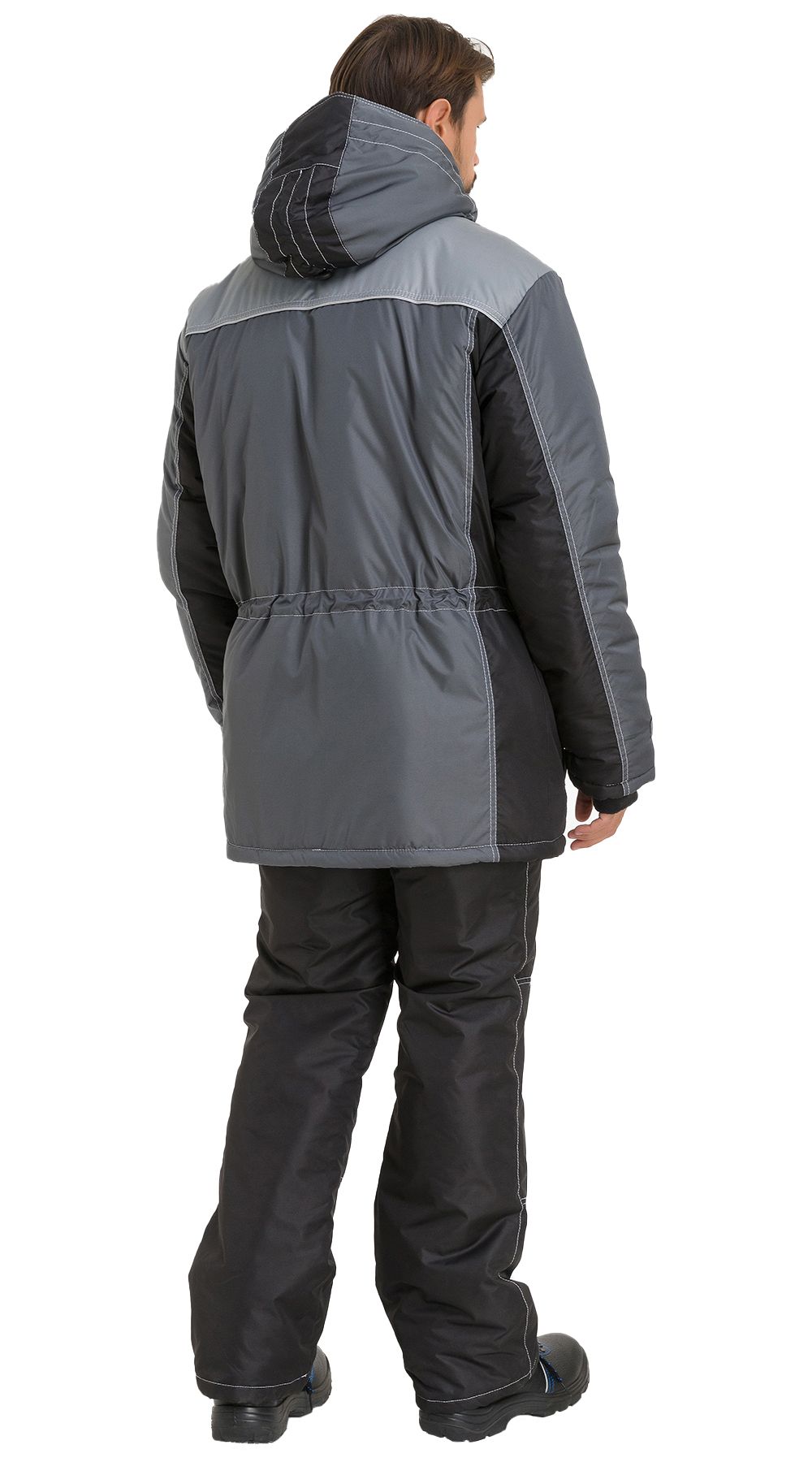 Конструктивно изделие представляет из себя куртку с притачной утепляющей подкладкой, центральной застежкой на тесьму-молнию, двойной ветрозащитной планкой, застегивающейся на контактную ленту, с втачными рукавами и притачным капюшоном. Полочки и спинка с кокетками из отделочной ткани №1 и световозвращающим стрейч-кантом. Отрезные бочки полочек, нижняя и локтевые части и пата рукава, средняя часть капюшона из отделочной ткани №2 черного цвета.