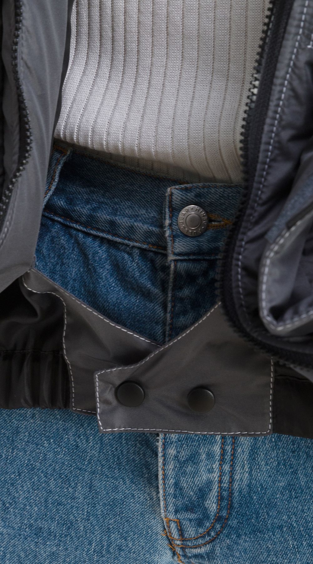 Застежка центральная на двухзамковую тракторную тесьму-молнию, закрытую ветрозащитными планками и подбородочным клапаном. В край левой планки вставлены отделочные флажки из стропы, для удобства расстегивания контактной ленты. На подкладке куртки по линии бедра ветрозащитная юбка, застегивающаяся на две кнопки.