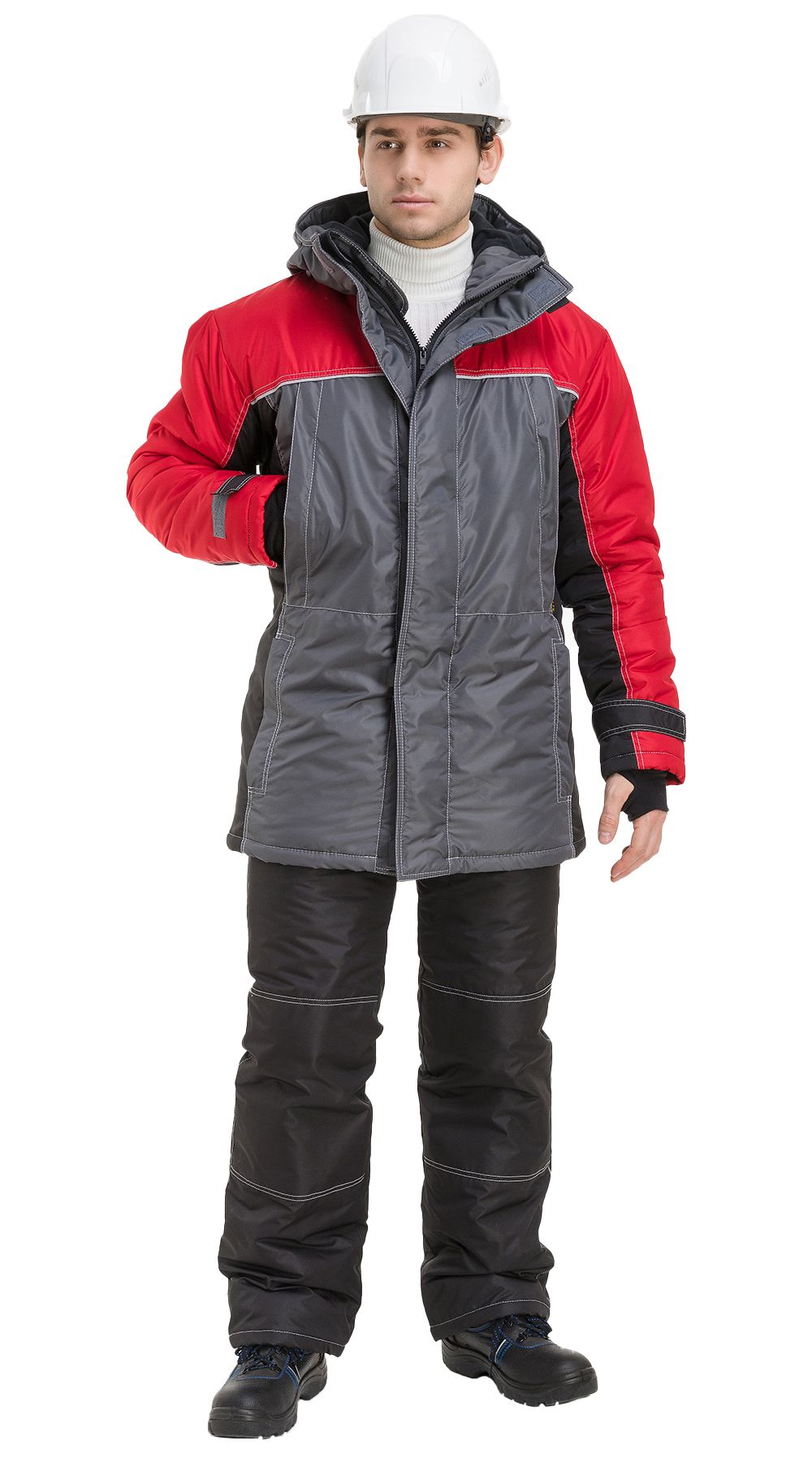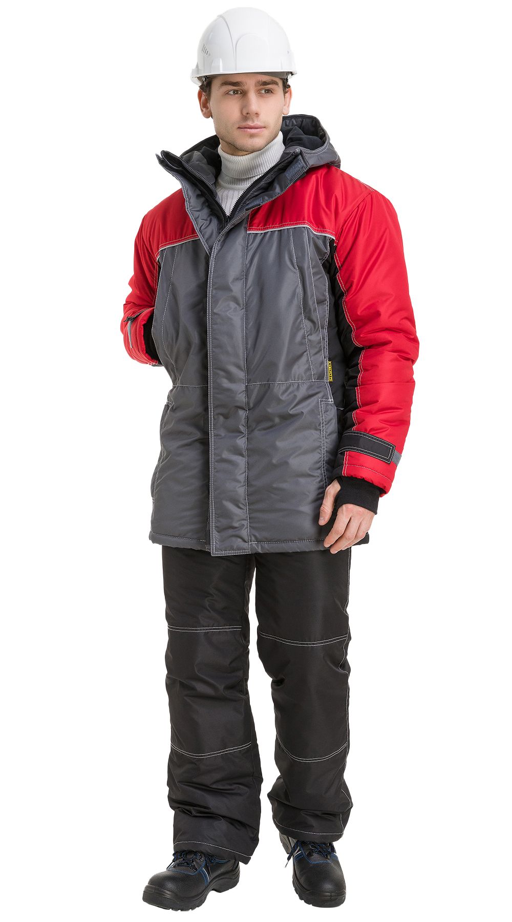 Конструктивно изделие представляет из себя куртку с притачной утепляющей подкладкой, центральной застежкой на тесьму-молнию, двойной ветрозащитной планкой, застегивающейся на контактную ленту, с втачными рукавами и притачным капюшоном. Полочки и спинка с кокетками из отделочной ткани №1 и световозвращающим стрейч-кантом. Отрезные бочки полочек, нижняя и локтевые части и пата рукава, средняя часть капюшона из отделочной ткани №2 черного цвета.