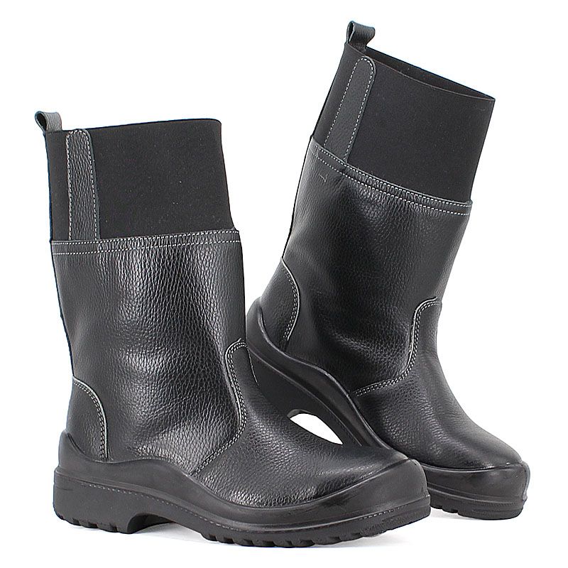 ? Верх обуви: полностью выполнен из натуральной кожи (юфть яловая толщиной 2,0 мм). Кожаное голенище по верху стянуто широкой эластичной лентой для предотвращения попадания искр и брызг расплавленного металла, окалины во внутрь обуви. Для удобства надевания манжета снабжена кожаными накладками.